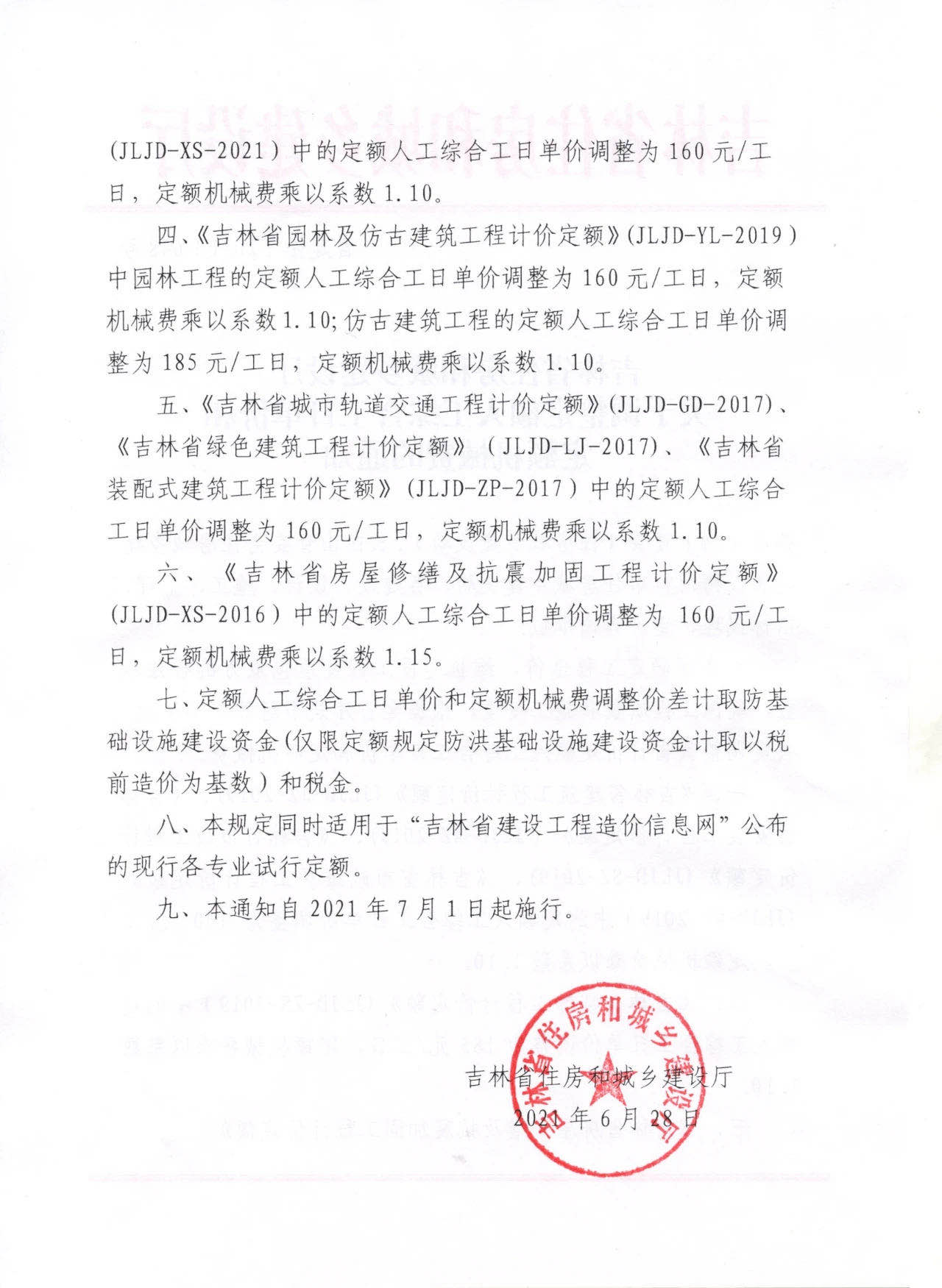 现将《吉林省住房和城乡建设厅关于调整定额人工综合工日单价和定额机械费的通知》(吉建函〔 2021 〕648号),转发到协会网站上,以便对照执行。