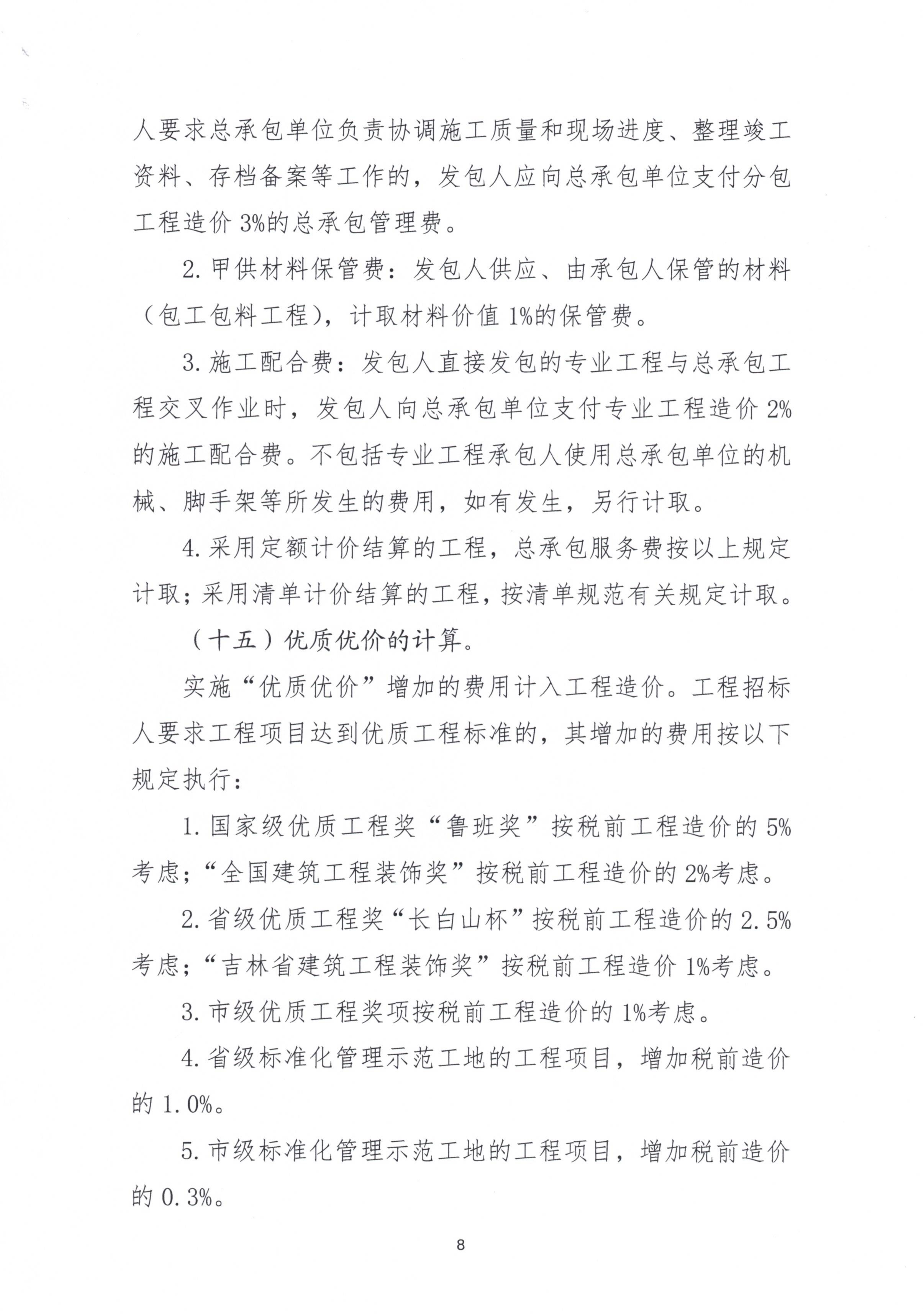 日前,吉林省建设工程造价管理站发布《吉林省建设工程结算工作指导》文件,按照现行工程结算的基本原则和计价依据,对工程结算中的16个常见问题作出指导性意见。特别是对优质优价的计算明确提出,工程招标人要求工程项目达到国家级优质工程奖“鲁班奖”标准的,按税前工程造价的5%计价;达到吉林省优质工程奖“长白山杯”标准的,按税前工程造价的2.5%计价;达到“全国建筑工程装饰奖”标准的,按税前工程造价的2%计价;达到省级标准化管理示范工地、“吉林省建筑工程装饰奖”、市级优质工程奖项标准的,按税前造价的1%计价;达到市级标准化管理示范工地标准的,按税前造价的0.3%计价。现将通知原件转发给你们,还可通过扫描文末二维码下载通知全文。